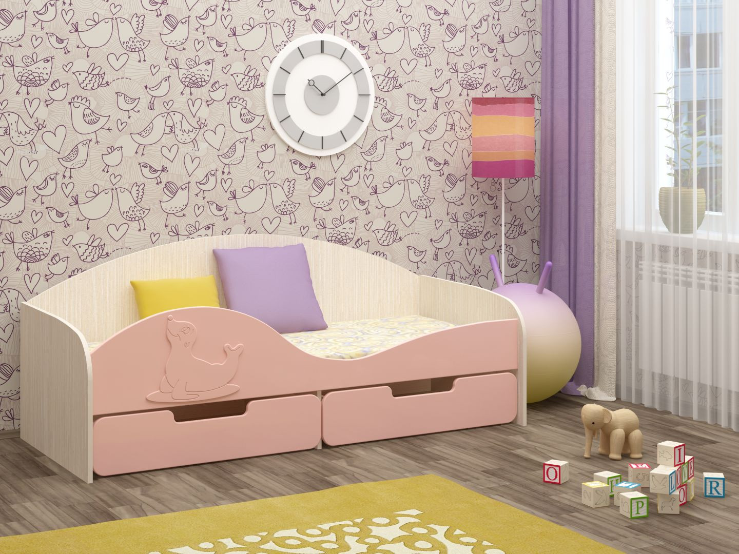 Кровать "Юнга-8" МДФ - превосходный выбор для детской комнаты вашего ребенка. Кровать оснащена бортиком с накладкой в виде милого тюленя, который защищает вашего ребенка от возможного падения во сне. Снизу кроватки находятся два выдвижных ящика, в которых удобно хранить детские игрушки, одежду или белье. Эта оригинальная кроватка поразит Вас своим милым дизайном.